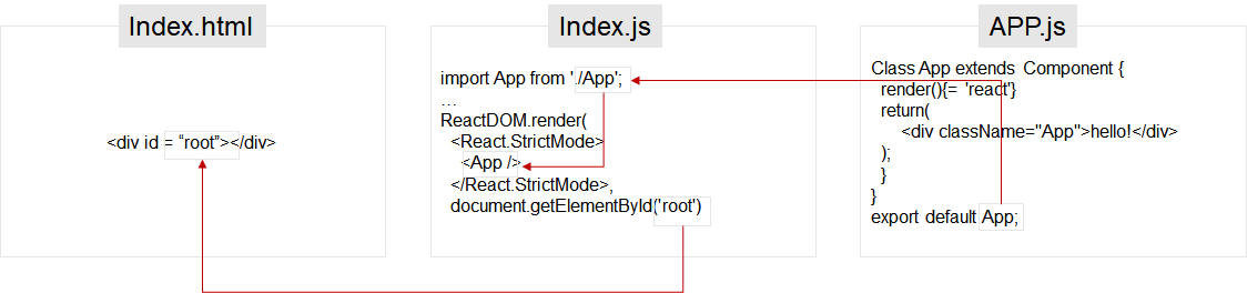 + React Component (예, App.js)를 출력하기 위해서 사용하는 함수