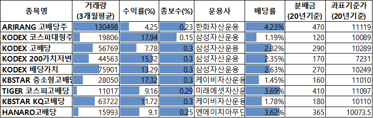 아래는 거래량 상위 중 몇가지 관심 있는 배당 EFT에 대해서 추려서 분석해본 내용