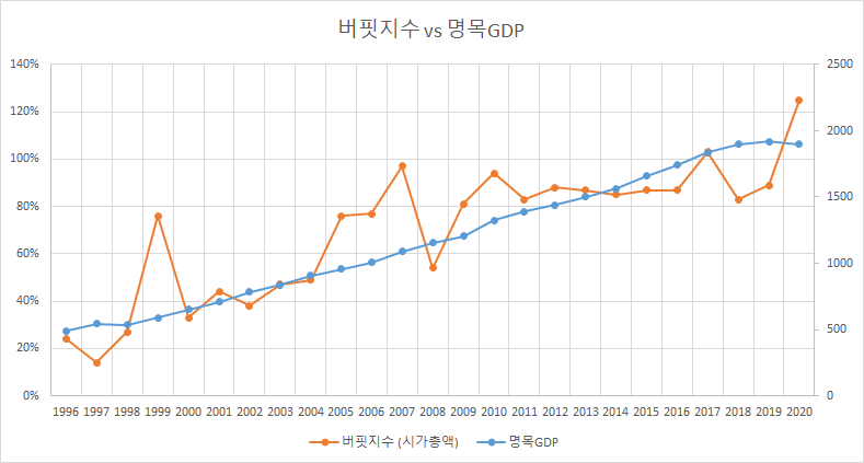 버핏 지수만 보면 17년과 20년도 주식 시장이 과열이였네요.