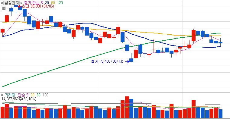 5일 이평선 - 심리선 : 투자자들의 한주의 심리 상태 파악 가능
