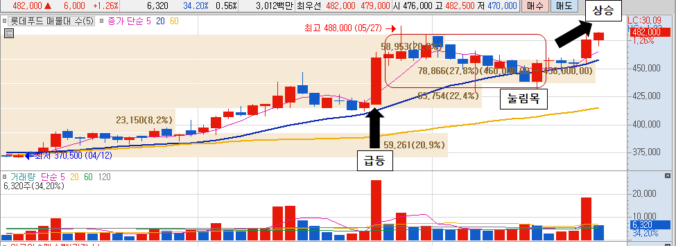 아래는 주식이 급등하다가 눌림목이 나타난 현상이 있는 차트이다 (예, 롯데푸드)