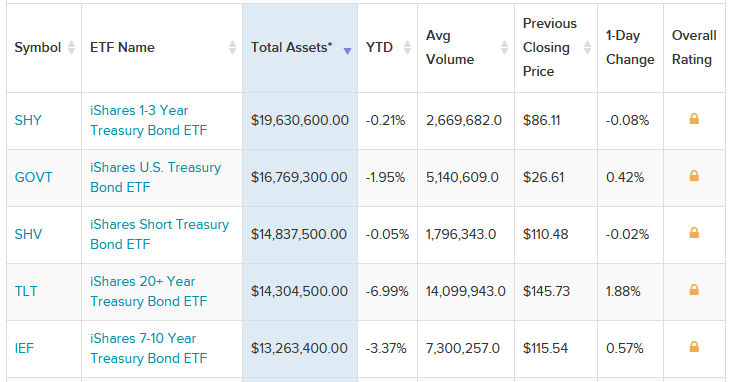 총 자산 순위 상위로 SHY/GOVT/SHV/TLT/IEF가 있다.