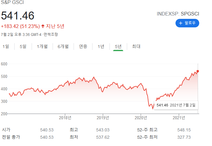 아래는 구글에서 검색한 S&P GSCI 지수이다. 코로나 대비 2배 이상 증가하고 있는 것으로 확인할 수 있다.