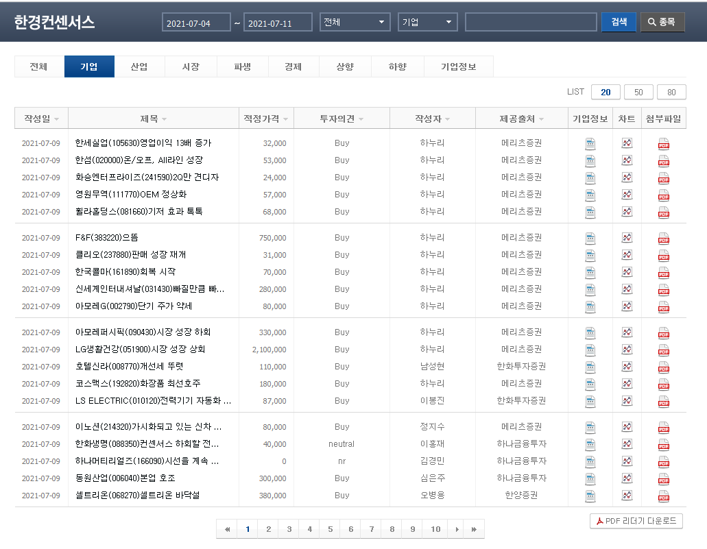 기간과 기업을 검색 필터링해서 종목 리포트를 볼 수 있다.