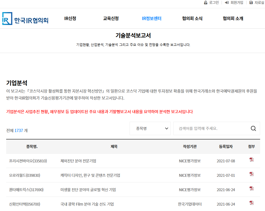 IR협의회로 이동 호 IR 정보센터-기술분석보고서에서 기업에 대한 분석 내용을 확인할 수 있다.