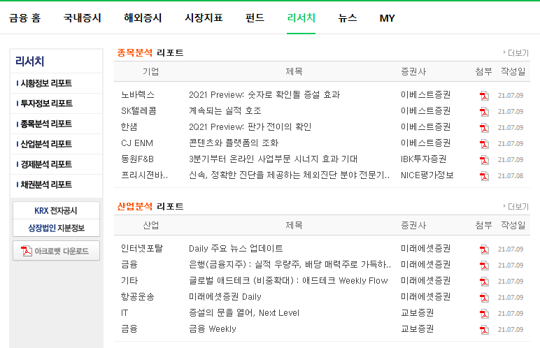 네이버 증권 - 리서치로 이동하면 아래와 같이 시황/종목 등에 대한 리포트 정보를 볼 수 있다.